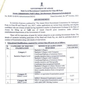 Assam Direct Recruitment 2023: State Level Recruitment Commissions of Govt. of Assam has released a notification for the huge post of Grade III and IV post. There are total no. of 12600 post of Grade III and IV. All the interested and eligible candidate can apply for the post. The online application will start from 10 November. The candidate can apply online here or can directly through www.sebaonline.org or https://assam,gov.in/ .