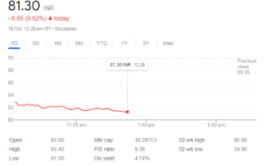 As of 9:55 am, Hudco’s stock price was trading at Rs 82.45 on the NSE, marking an 8.34 percent decrease from the previous day’s closing price. At 12:28 pm it was trading at Rs.81.30 marking an 8.65 percent decrease. Notably, the offer price of Rs 79 represents a 12.2 percent discount from the closing price on October 17.