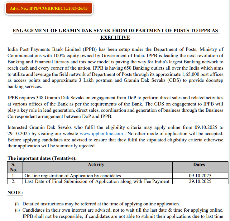 India Post Payments Bank has released a 2025 recruitment for 348 Executive Post. The online application has started from 9 October. Those who are Interested and eligible can apply before 29 October 2025 through official website www.ippbonline.com . To apply for the post go through the post to check the eligibility.