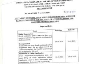 Odisha Sub-ordinate Staff Selection Commission recently released a notification for the 2712 post of Livestock Inspector, Forester and Forest Guard. The last date for the online registration is 20/11/23. The last date of online application is 25/11/23.