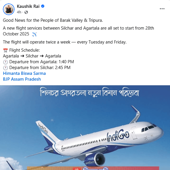 In a major boost to regional air connectivity, new flight services between Silchar and Agartala are all set to commence from October 28, 2025, as announced by Assam Minister Kaushik Rai.